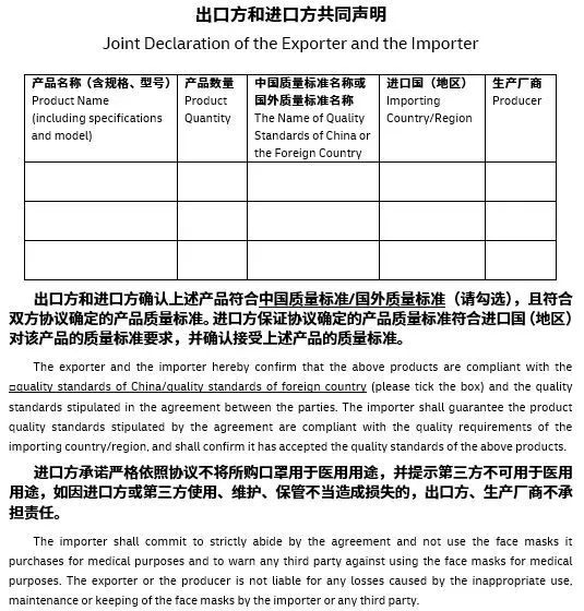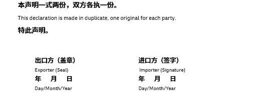 1. 加盖发件人公章 2. 声明中所有项不可为空,且填写内容要与符合的国外质量标准的信息保持一致 |